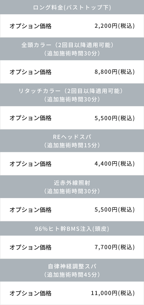 お顔にも使える高級美容成分を配合した、REオリジナルのシャンプーを使用。炭酸シャワーで頭皮の汚れを優しく落とし、健康な毛髪成長を促進させます。
